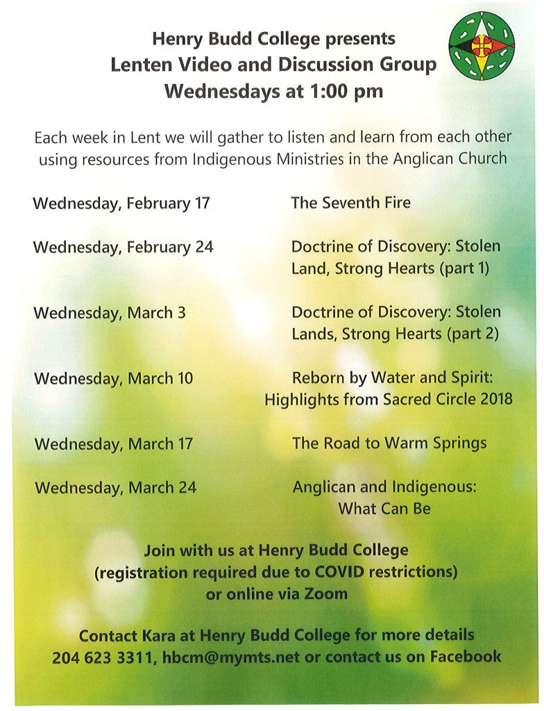 Others wanted to join in. One idea led to another and together we decided to use the 6 Wednesdays in Lent to view and discuss together some of the excellent resources that Indigenous Ministries (Anglican Church of Canada) has created. All are invited to join the video and discussion series. We will meet at Henry Budd College, keeping COVID restrictions in place but will also make a Zoom link available for others to join us.