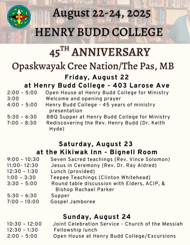 communities throughout northern Manitoba and beyond. On Friday, August 22, we’ll host a time of teaching and memory-sharing at Henry Budd College – 403 Larose Ave. We’ll be at the Kikiwak Inn on Saturday, August 23 for more teachings, sharing, and of course, an evening Gospel Jamboree. And on Sunday, August 24, we’ll have a joint celebration service at Church of the Messiah. Please visit the Henry Budd College for Ministry Facebook page or see the attached schedule.
