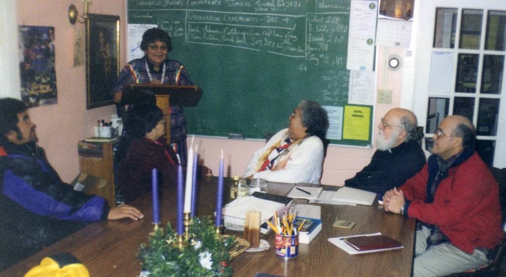 Initiated by Bishop John Conlin, Diocese of Brandon, the Henry Budd Christian Training Centre officially opened its doors on September 20, 1980. In 1991, Its name was changed to Henry Budd College for Ministry, according to co-director Alyson Barnett-Cowan, “to reflect what it truly was and did, rather than sounding like a technical school.” Establishing a local college for ministry training acknowledged how commitment to family, responsibility to community, and financial restrictions prevented many First Nations people from studying at seminaries in the south. Furthermore, HBCM provided opportunities for people to express the teachings of Jesus within their own unique Cree, Métis, and northern cultures and contexts. The College’s emblem reflects these realities. A green circle encloses the footprints of followers travelling together around teepees pointing in the four directions, which face an inner circle filled with hearts—the divine “Love which dances at the heart of things” (Malcolm Guite, poet). In addition to St. Faith’s Chapel, the College contains one main classroom and reference library, an office for the resident Elder, the Ven. Lydia Constant who famously proclaimed in 1984, “I’m just coming for this one class; I’m not committing to anything!”, the coordinator’s office, a newly renovated upstairs apartment for visiting guests, and a kitchen for preparing coffee, tea, meals, and biscuits to refresh students and visitors alike—Henry Budd would have approved!