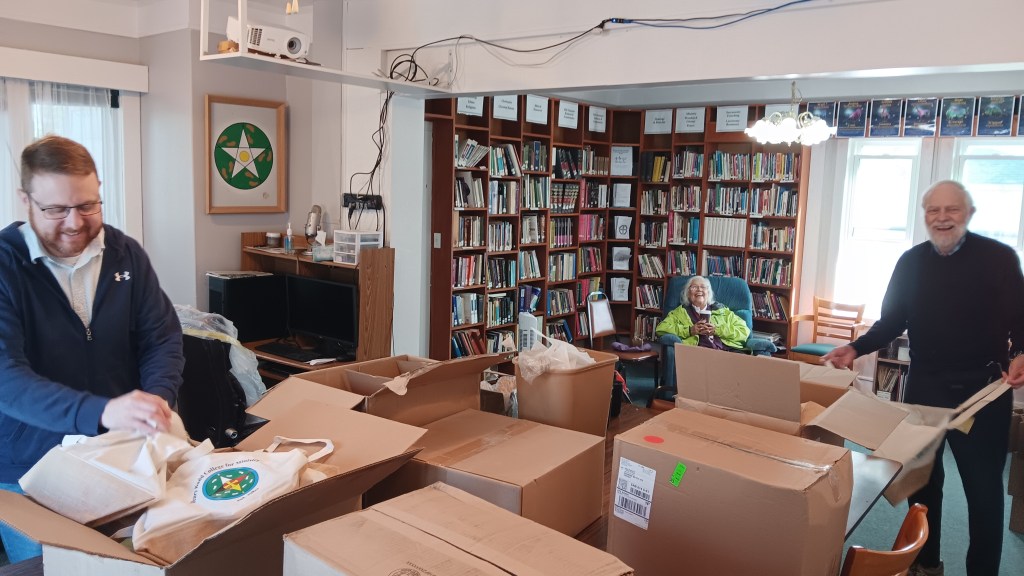 The festivities began on Friday, August 22, 2025with the Very Rev. Chris Evetts unloading boxes he graciously brought from Brandon – our 45th Anniversary giveaways! The Rev. Paul Sodtke, former co-Coordinator of HBCM (his wife Marion Jenkins was unable to join us). Chris and Kara created the giveaway assembly line, under the watchful supervision of our elder, Lydia.