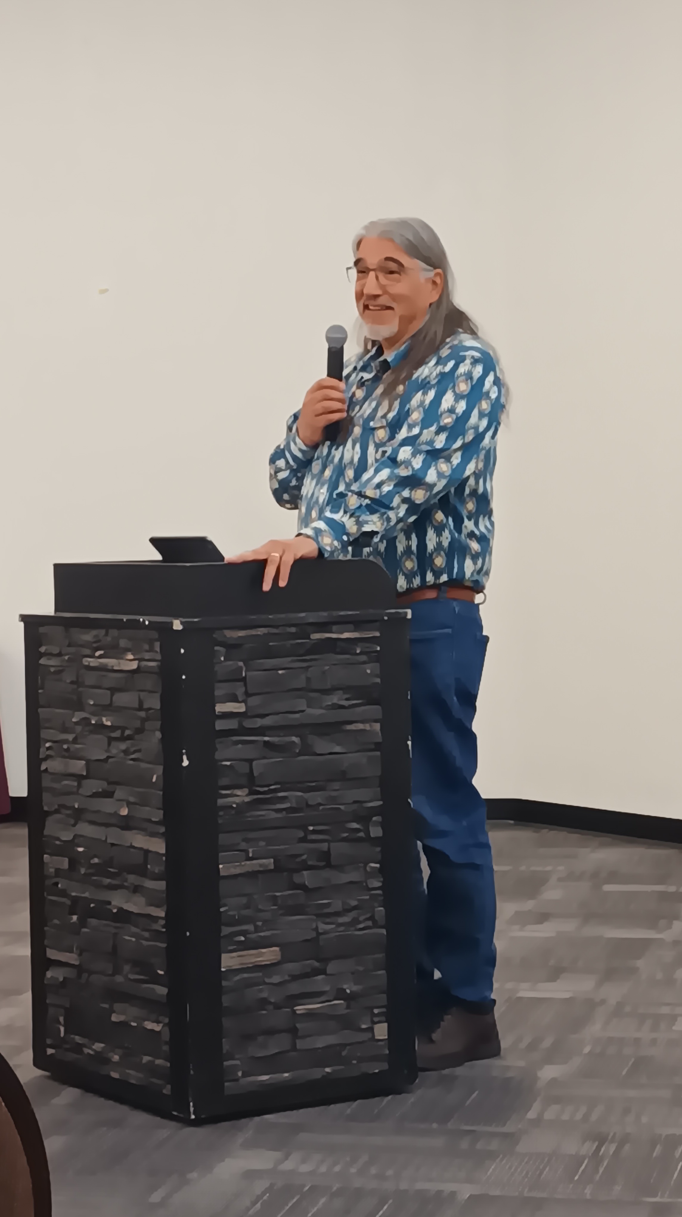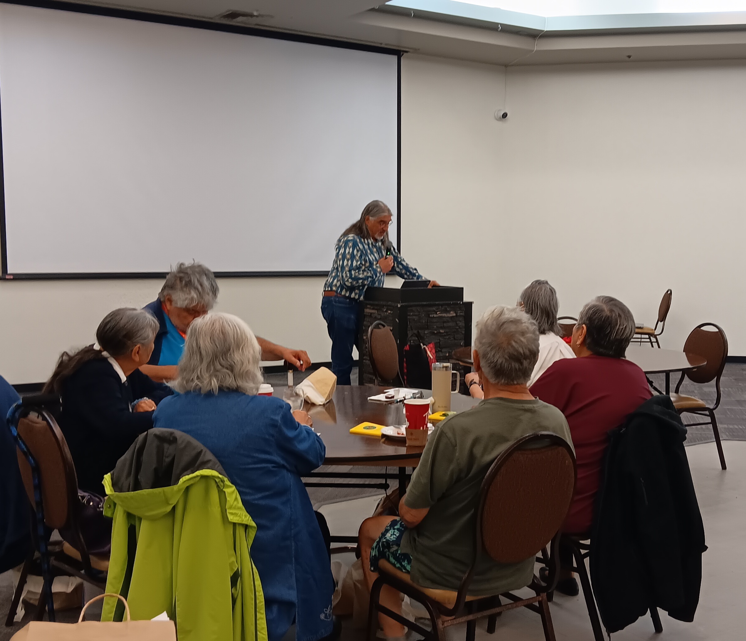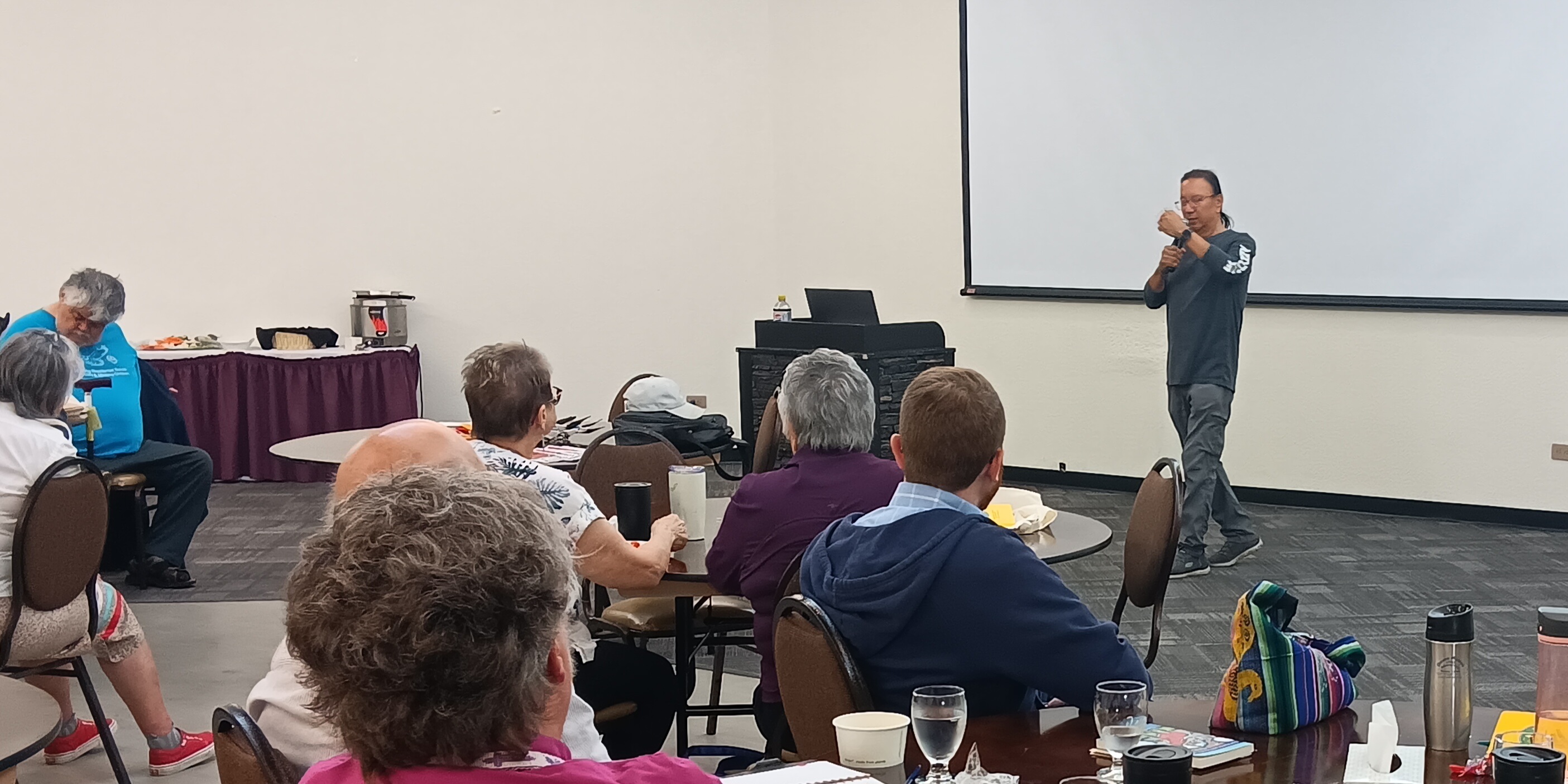 After a bannock break, we were then privileged to hear from the Rev. Dr. Ray Aldred, director of the Indigenous Studies Program at Vancouver School of Theology. Rev. Ray spoke on Jesus in Ceremony – expertly drawing from Scripture, traditional Indigenous teachings, and the teachings of the early church elders. He organised his teaching around three main early church principles that are still essential today: 1. There is only one God – God, Jesus and the Holy Spirit are one ; 2. Jesus Christ came in the flesh – he is both Creator and creation; 3. the “maximization of Jesus” –the first elders and teachers of the faith saw Jesus and his work everywhere. Ray’s wide-ranging session included sharing the 7 directions prayer, teaching on Baptism and Communion as ceremonies that unite both Creator and creation, and an encouragement to “know your creation story.” Rev. Ray’s teachings reminded us that God our Creator speaks through our Scriptures, ceremonies, the land, and the elders of the church.