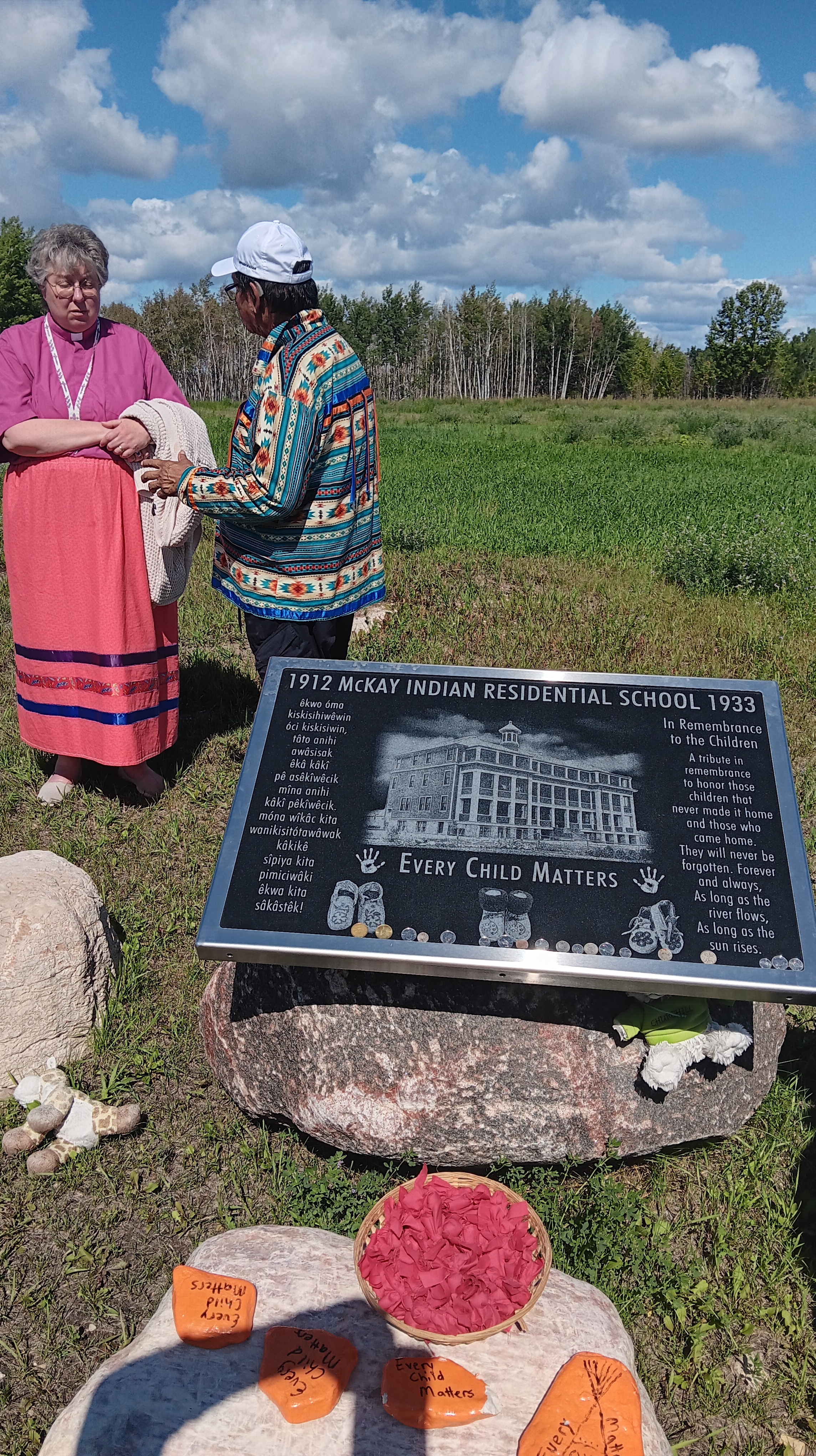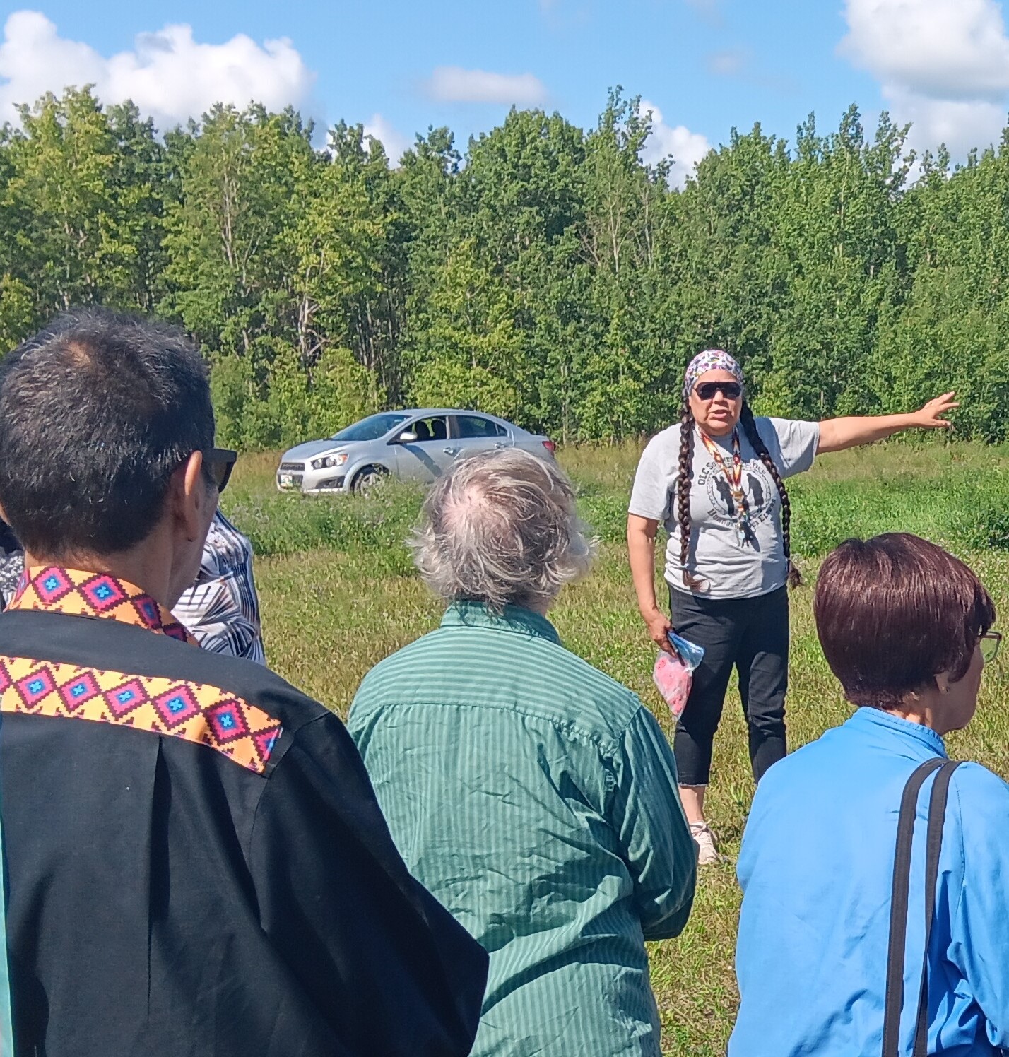 After the service, we made our way to Church of the Redeemer for a soup and sandwich lunch, provided by Donna Asmus and her team. Members of the three local Anglican Churches don’t always have to opportunity to meet together, so we wanted to make the most of our time of fellowship! After lunch, those who were able boarded the school bus to head to Fisher Island, the site of the former Anglican Residential School. Charlie Lathlin arranged for Janet Head to share with us the work that they are doing at the site to uncover potential unmarked graves, as well as to memorialise the space. Janet shared the difficult stories of the children who lived, studied, and worked at the school, and some of the participants shared their own memories of the site of the school, which burned to the ground in 1933. As the daughter of HBCM student the Rev. Hagar Head, Janet shared her mother’s fierce determination to not let the institution of the church erase or erode her Cree identity and teachings, inviting representatives of the church to come alongside them in this work: “We need the prayers of the church and we need your songs”. We were able to pray and offer tobacco ties, which were blessed at the morning service, at the site. This was a fitting end to our 45th anniversary celebration, as we must always acknowledge and be aware of the legacy that we leave.
