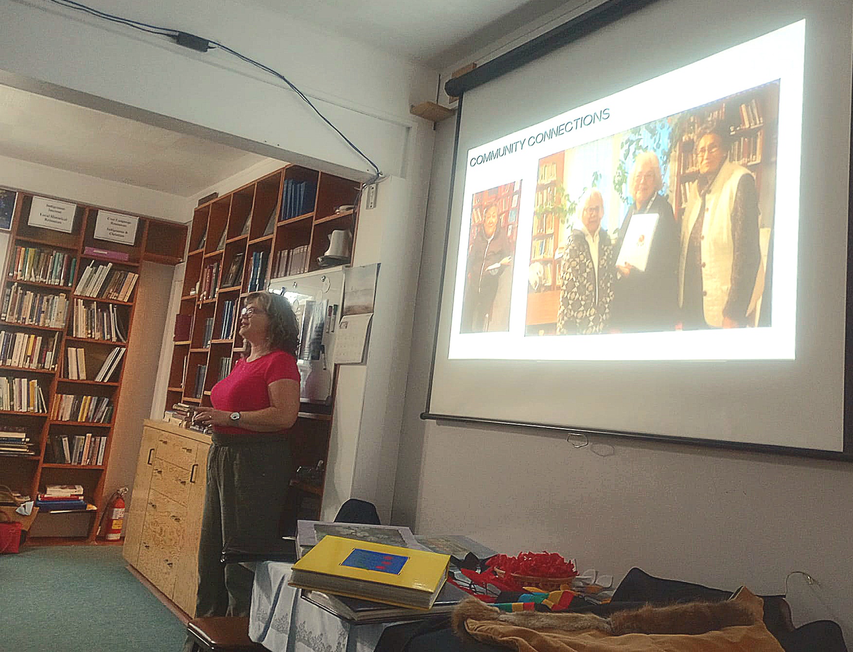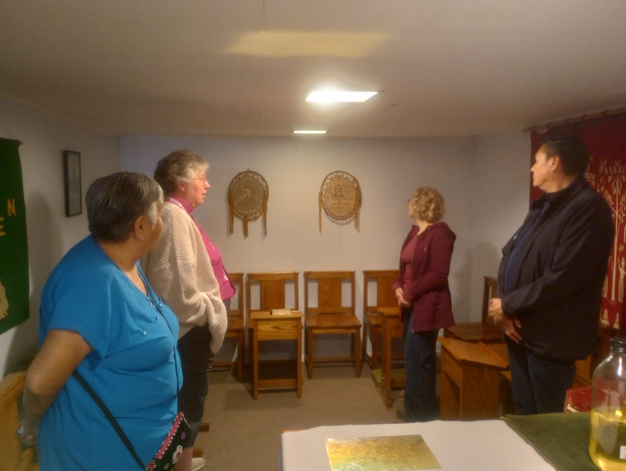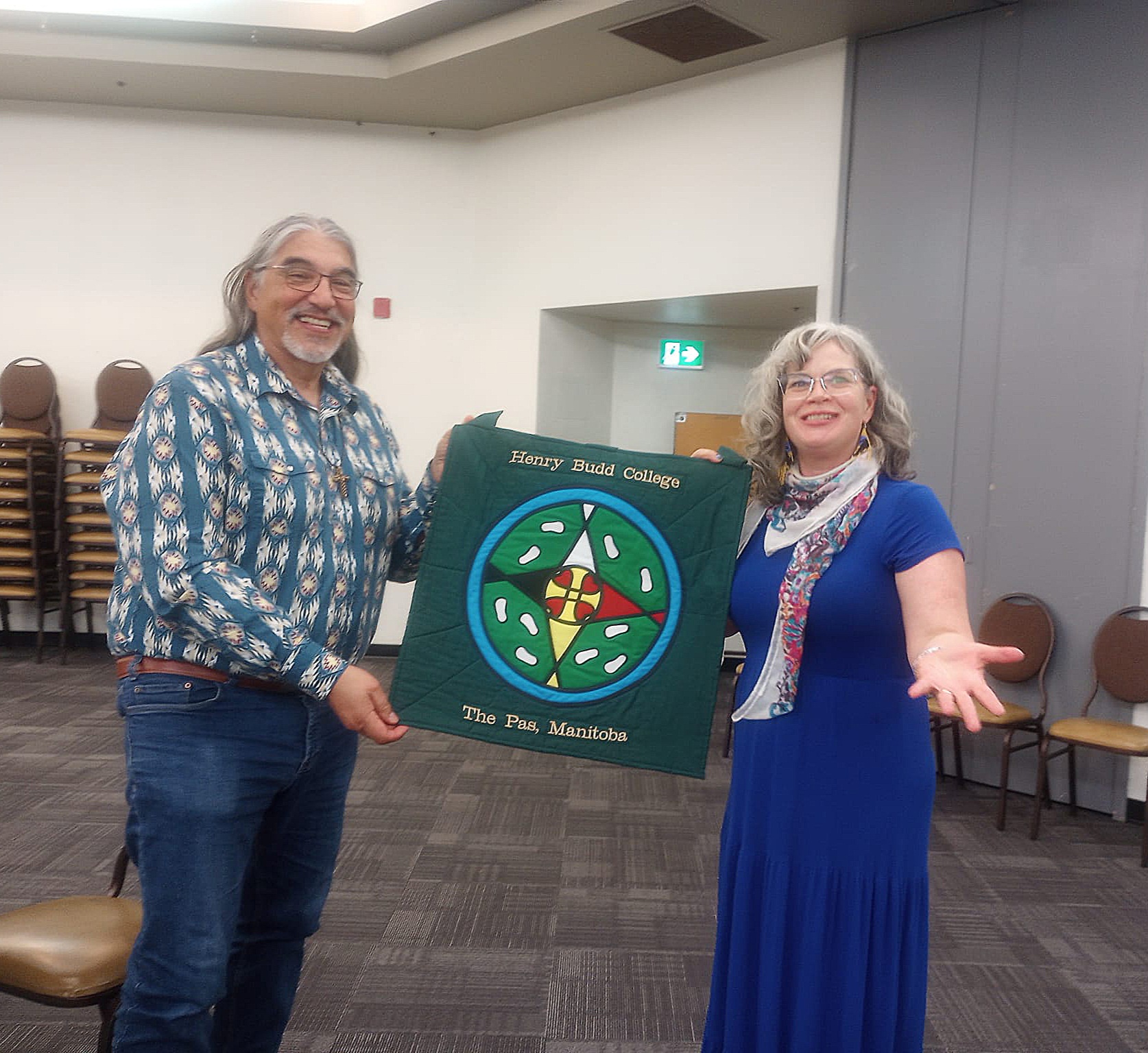 We concluded the day’s teachings with a short time of reflection. The Right Rev, Rachael Parker, Bishop of the Diocese of Brandon, Ven. Lydia, and Rev. Paul were also asked to share their reflections of the day. Bishop Rachael connected deeply with Rev. Vince’s visions, and Rev. Paul shared about his time as HBCM coordinator. Ven. Lydia spoke on her long history with Henry Budd College, sharing the story of how Rev. Priscilla Constant invited her to a class, and despite the fact that Lydia said she’d only come for one class, she’s still here! Kara made some presentations to mark the 45th anniversary, presenting Henry Budd College hangings, made by Sue Harper, to Elder Lydia, Bishop Rachael, and Rev. Dr. Ray, acknowledging the long-standing relationships with the College. After thanking Rev. Paul and Rev. Chris for their help, we gave thanks to God for a meaningful day.