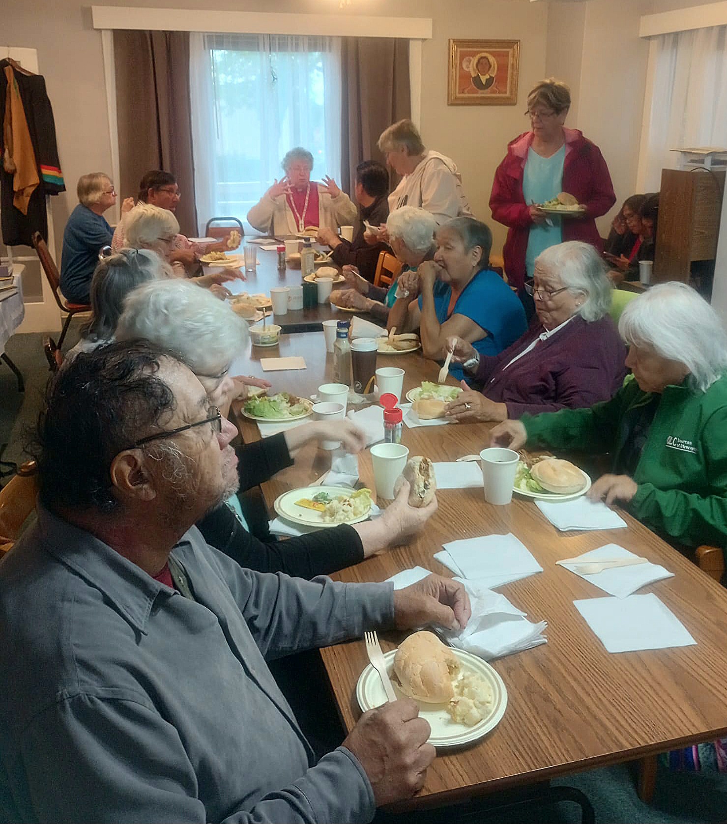 Others popped in during the morning, offering to do last-minute chores, and we all joined in a lunch together, making the collective call to have our activities inside the College, as the wind howled and the rain poured. Ingar gave a welcome and opening prayer, and we spent the afternoon visiting, looking at photo albums, and sharing memories. Kara gave a presentation on the history of HBCM, and many of those gathered shared their memories and insights as well. We all squeezed into the College for our BBQ supper, with thanks to Janice Seto, who helped us manage the small spaces, making sure everyone got served. After supper, Keith gave his presentation on the Rev. Henry Budd, Sr. – a highlight for many people. It was a wonderful way to begin our weekend celebration – honouring the life and legacy of the College’s namesake!